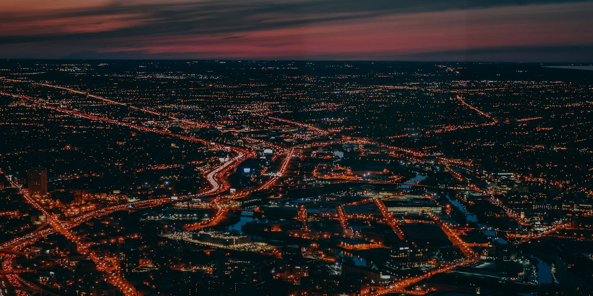 Vue aérienne nocturne d’une grande agglomération illuminée, symbolisant la complexité des difficultés externes rencontrées par les entreprises et la nécessité d’un accompagnement juridique stratégique.